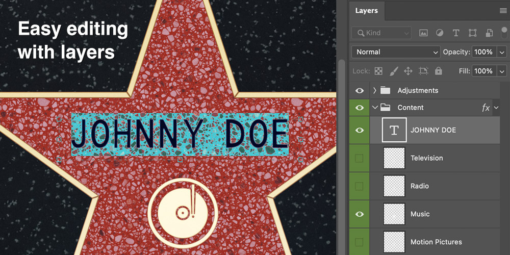 Create your own Walk of Fame plaque with this high-resolution template. Digital bundle includes a high-resolution 3000x3000 px template for Adobe Photoshop with category icons. Authentic Hollywood Star font included. For non-commercial use only.